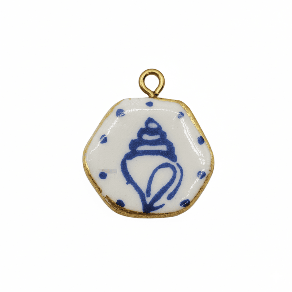 This unique hexagonal pendant features a beautiful hand-painted blue conch on white ceramic, framed by a delicate gold-toned edge.