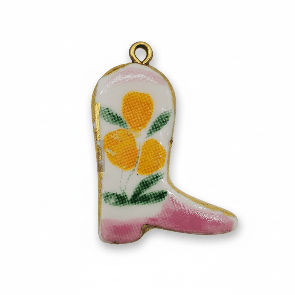 This unique pendant features a ceramic boot, adorned with a vibrant motifs such as flowers or hearts.