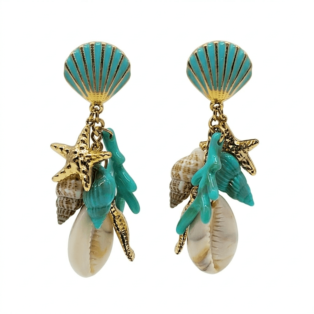 Each earring is meticulously crafted, beginning with a striking scalloped shell stud in a vibrant turquoise hue, rimmed with detailed gold plating.