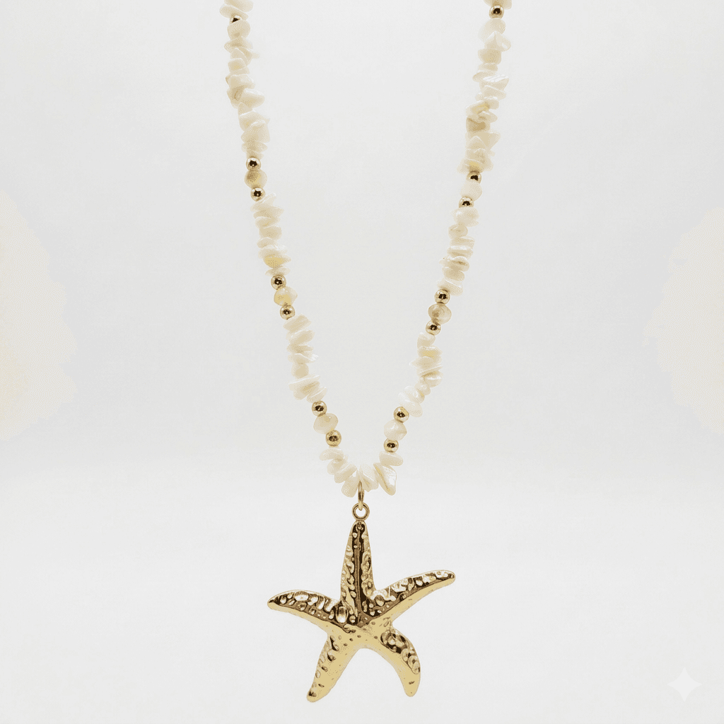 The central focal point is a grand, textured starfish pendant, meticulously crafted with a hammered gold-toned finish that catches and reflects light with every movement, creating a radiant, sun-kissed effect.